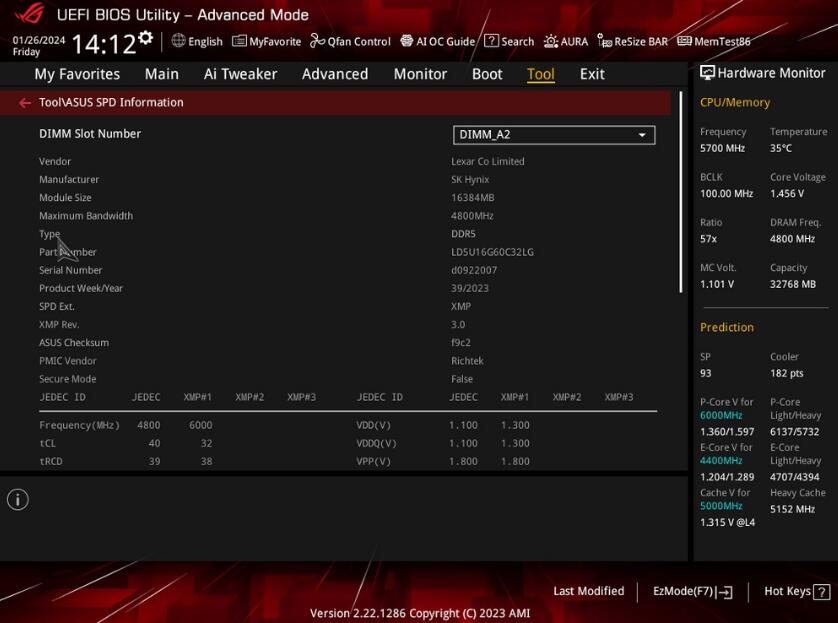在BIOS查看內存SPD信息,Lexar THOR DDR5 6000 16GBx2采用SK Hynix DRAM颗粒,PMIC制造商为Richtek,JEDEC频率为4800MT/s CL40-39-39-77-116,电压1.1V,提供1组XMP参数6000MT/s CL32-38-38-96-134。