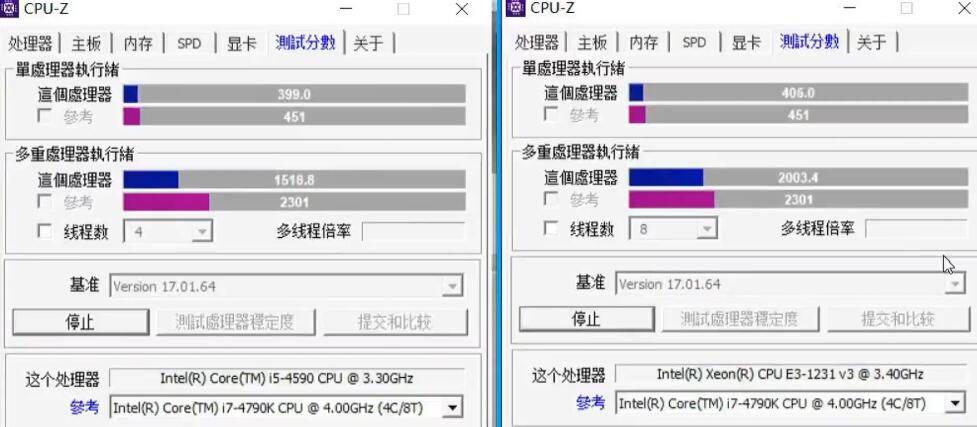 CPU-Z跑分方面,i5 4590和E3 1231V3在单线程方面相差不大,但在多线程方面1231V3领先了28%以上。